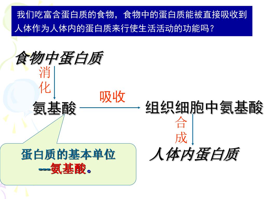 食物中蛋白质 消化 吸收 组织细胞中氨基酸 氨基酸 合成 人体内蛋白质 我们吃富含蛋白质的食物,食物中的蛋白质能被直接吸收到人体作为人体内的蛋白质来行使生活活动的功能吗? 蛋白质的基本单位 ---氨基酸。