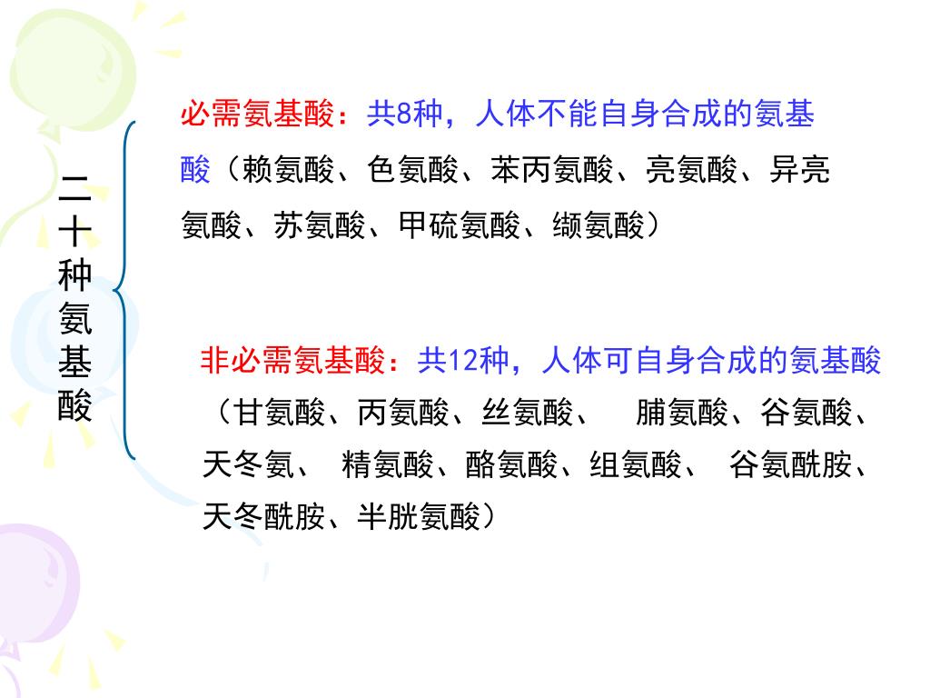 必需氨基酸:共8种,人体不能自身合成的氨基 酸(赖氨酸、色氨酸、苯丙氨酸、亮氨酸、异亮氨酸、苏氨酸、甲硫氨酸、缬氨酸) 二十种氨基酸 非必需氨基酸:共12种,人体可自身合成的氨基酸(甘氨酸、丙氨酸、丝氨酸、 脯氨酸、谷氨酸、天冬氨、 精氨酸、酪氨酸、组氨酸、 谷氨酰胺、天冬酰胺、半胱氨酸)