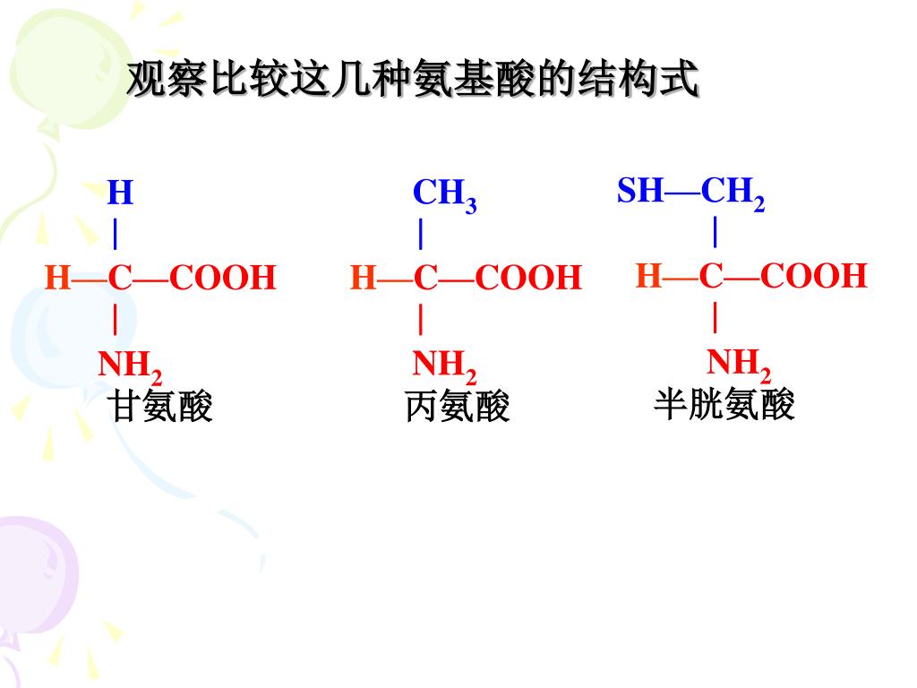 观察比较这几种氨基酸的结构式 SH—CH2 |H—C—COOH |NH2 半胱氨酸 H |H—C—COOH |NH2 甘氨酸 CH3|H—C—COOH|NH2 丙氨酸