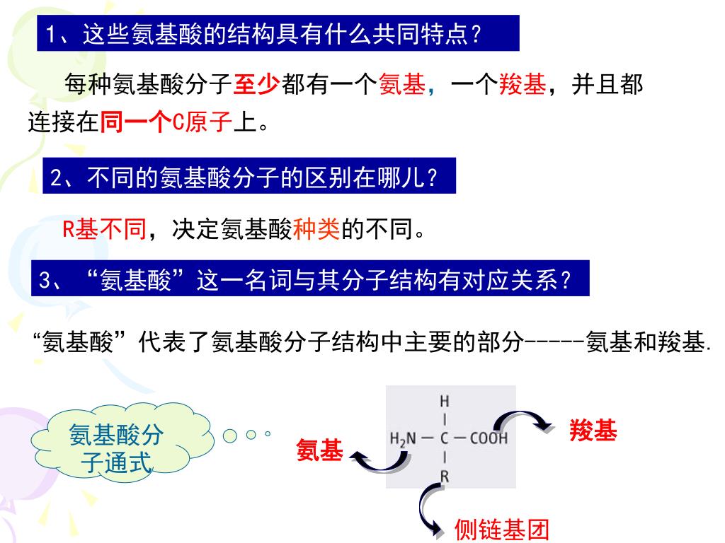 羧基 氨基 侧链基团 1、这些氨基酸的结构具有什么共同特点? 每种氨基酸分子至少都有一个氨基,一个羧基,并且都连接在同一个C原子上。 2、不同的氨基酸分子的区别在哪儿? R基不同,决定氨基酸种类的不同。 3、“氨基酸”这一名词与其分子结构有对应关系? “氨基酸”代表了氨基酸分子结构中主要的部分-----氨基和羧基. 氨基酸分子通式