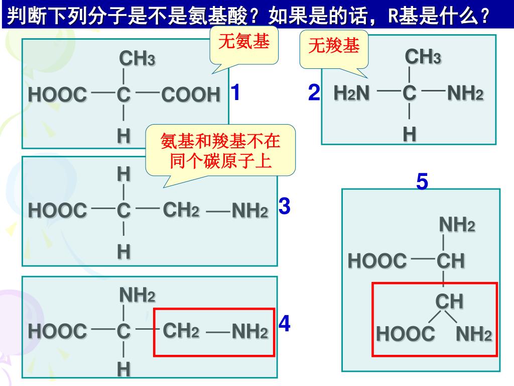 判断下列分子是不是氨基酸?如果是的话,R基是什么?判断下列分子是不是氨基酸?如果是的话,R基是什么? 无氨基 无羧基 CH3 CH3 1 2 H2N C NH2 HOOC C COOH H H 氨基和羧基不在同个碳原子上 H 5 3 CH2 HOOC C NH2 NH2 H HOOC CH NH2 CH 4 CH2 HOOC C NH2 HOOC NH2 H