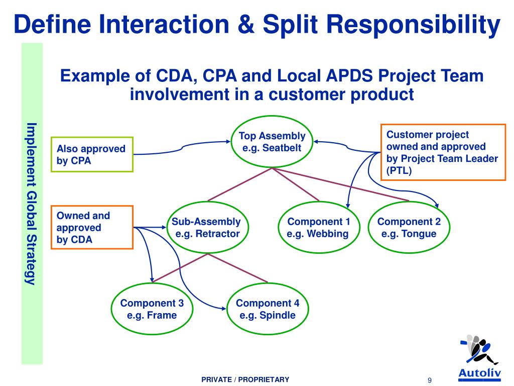 Define Interaction & Split Responsibility Example of CDA, CPA and Local APDS Project Team involvement in a customer product Implement Global Strategy Top Assembly e.g. Seatbelt Customer project owned and approved by Project Team Leader(PTL) Also approved by CPA Sub-Assembly e.g. Retractor Component 1 e.g. Webbing Component 2 e.g. Tongue Owned and approved by CDA Component 3 e.g. Frame Component 4 e.g. Spindle