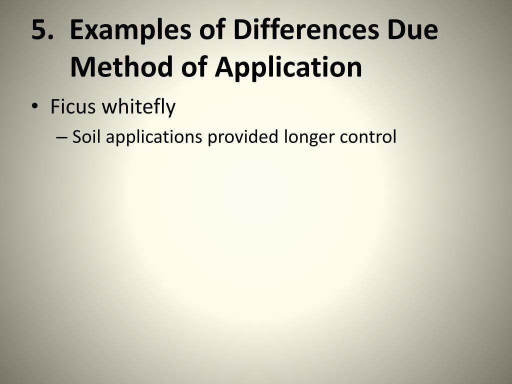 5. Examples of Differences Due Method of Application • Ficus whitefly • Soil applications provided longer control