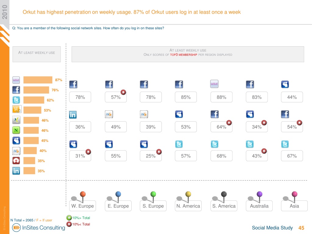 Orkut has highest penetration on weekly usage. 87% of Orkut users log in at least once a week 2010 Q: You are a member of the following social network sites. How often do you log in on these sites? At least weekly use At least weekly use Only scores of top3 membership per region displayed 78% 57% 78% 85% 88% 83% 44% 36% 49% 39% 53% 64% 34% 54% 31% 55% 25% 57% 68% 43% 67% W. Europe E. Europe S. Europe N. America S. America Australia Asia 10%> Total N Total = 2065 / F = If user 10%< Total