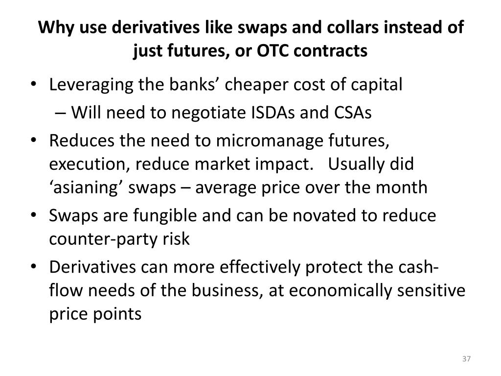 Why use derivatives like swaps and collars instead of just futures, or OTC contracts • Leveraging the banks’ cheaper cost of capital • Will need to negotiate ISDAs and CSAs • Reduces the need to micromanage futures, execution, reduce market impact. Usually did ‘asianing’ swaps – average price over the month • Swaps are fungible and can be novated to reduce counter-party risk • Derivatives can more effectively protect the cash-flow needs of the business, at economically sensitive price points
