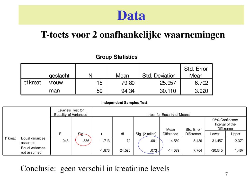 Data Is er een verschil tussen mannen en vrouwen m.b.t. gemiddelde kreatinine level ? Statistische toets H0: µman = µvrouw H1: µman ≠ µvrouw Twee steekproeven t-test 6