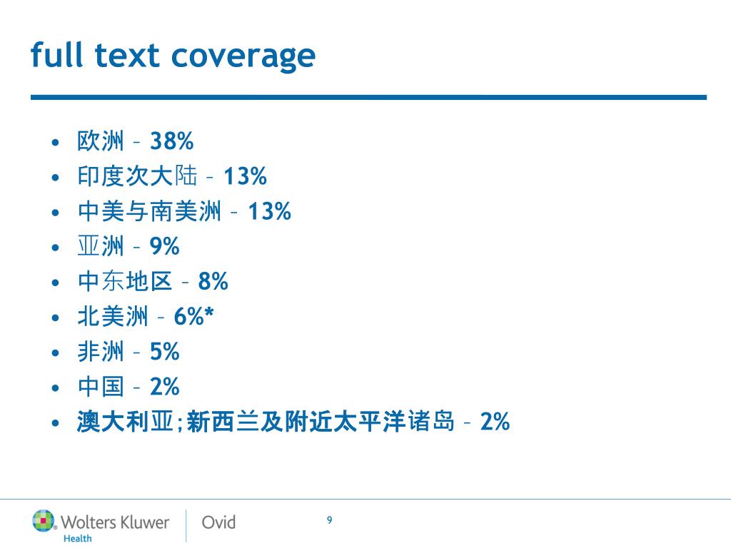 full text coverage • 欧洲 – 38% • 印度次大陆 – 13% • 中美与南美洲 – 13% • 亚洲 – 9% • 中东地区 – 8% • 北美洲 – 6%* • 非洲 – 5% • 中国 – 2% • 澳大利亚;新西兰及附近太平洋诸岛 – 2%