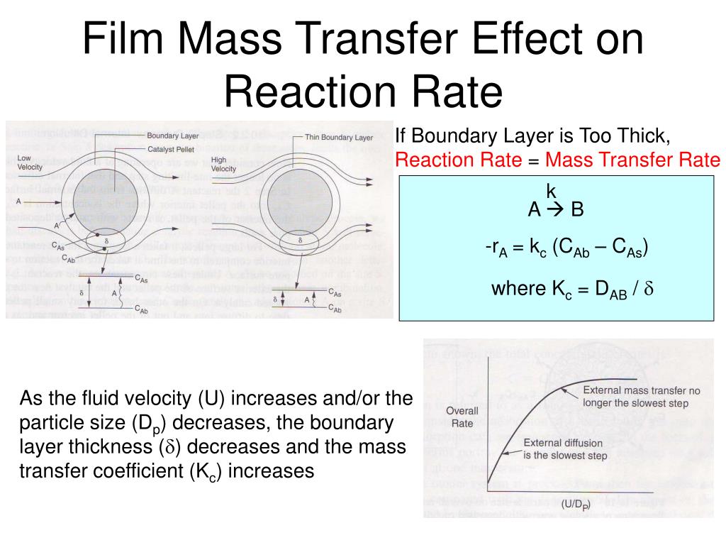 Film Mass Transfer Effect on Reaction Rate If Boundary Layer is Too Thick, Reaction Rate = Mass Transfer Rate k A B -rA = kc (CAb – CAs) where Kc = DAB / As the fluid velocity (U) increases and/or the particle size (Dp) decreases, the boundary layer thickness () decreases and the mass transfer coefficient (Kc) increases