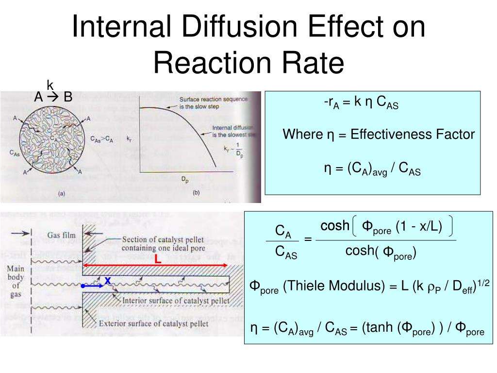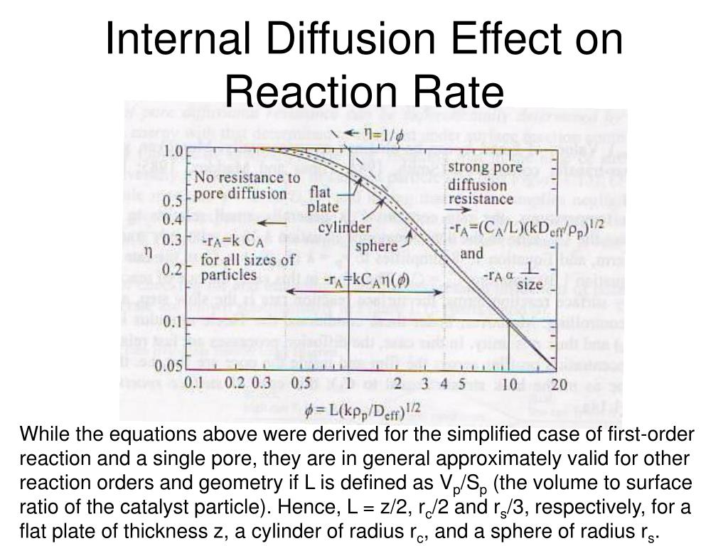Internal Diffusion Effect on Reaction Rate While the equations above were derived for the simplified case of first-order reaction and a single pore, they are in general approximately valid for other reaction orders and geometry if L is defined as Vp/Sp (the volume to surface ratio of the catalyst particle). Hence, L = z/2, rc/2 and rs/3, respectively, for a flat plate of thickness z, a cylinder of radius rc, and a sphere of radius rs.