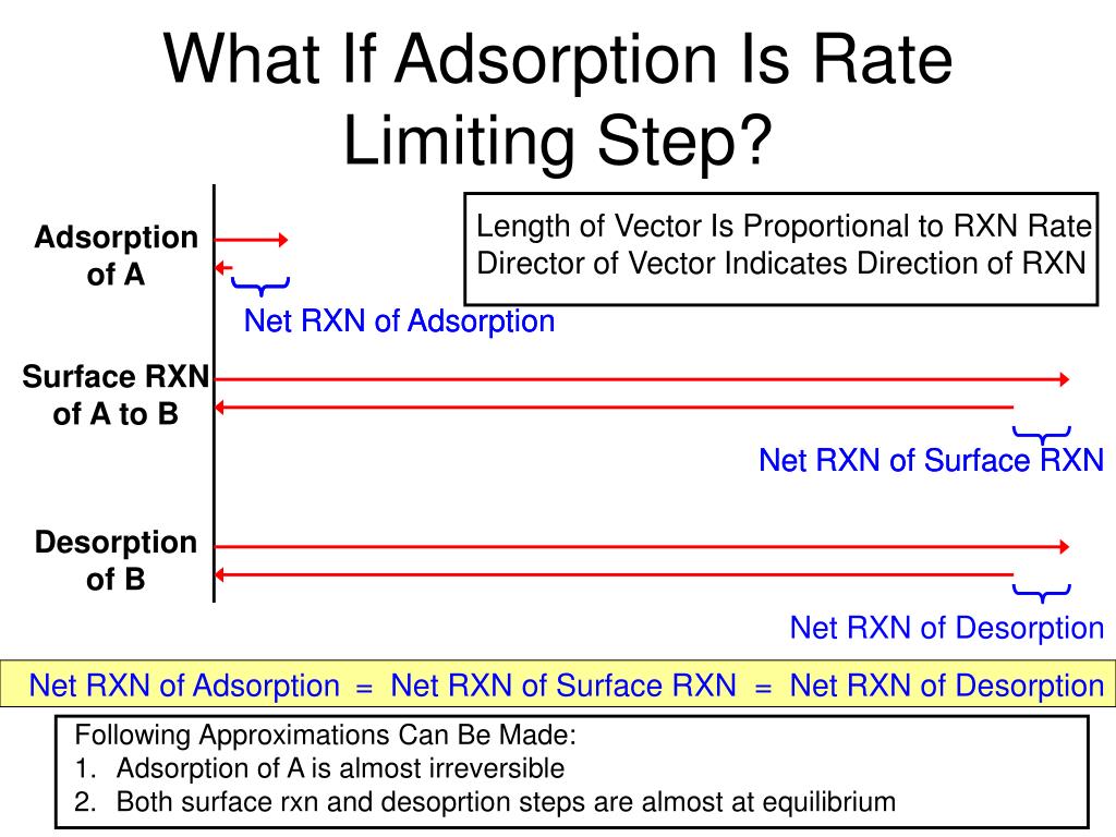 What If Adsorption Is Rate Limiting Step? Length of Vector Is Proportional to RXN Rate Director of Vector Indicates Direction of RXN Adsorption of A Net RXN of Adsorption Net RXN of Adsorption Surface RXN of A to B Net RXN of Surface RXN Net RXN of Surface RXN Desorption of B Net RXN of Desorption Net RXN of Adsorption = Net RXN of Surface RXN = Net RXN of Desorption • Following Approximations Can Be Made: • Adsorption of A is almost irreversible • Both surface rxn and desoprtion steps are almost at equilibrium