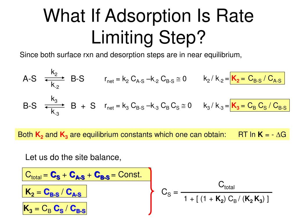 What If Adsorption Is Rate Limiting Step? From the site balance and quasi-equilibrium approximation, Ctotal CS = 1 + [ (1 + K2) CB / (K2 K3) ] From the rate limiting step, CA k1 Ctotal CA k1 Ctotal -rA = k1 CA CS = = 1 + [ (1 + K2) CB / (K2 K3) ] 1 + K’ CB Where K’ = (1 + K2) / (K2 K3) If A and B behave according to the ideal gas law, CA = PA / RT CB = PB / RT