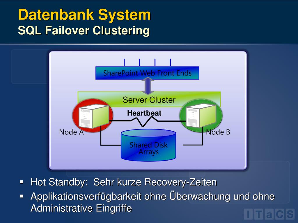 Datenbank SystemSQL Failover Clustering • Hot Standby: Sehrkurze Recovery-Zeiten • ApplikationsverfügbarkeitohneÜberwachung und ohne Administrative Eingriffe SharePoint Web Front Ends Server Cluster Heartbeat Node A Node B Shared Disk Arrays