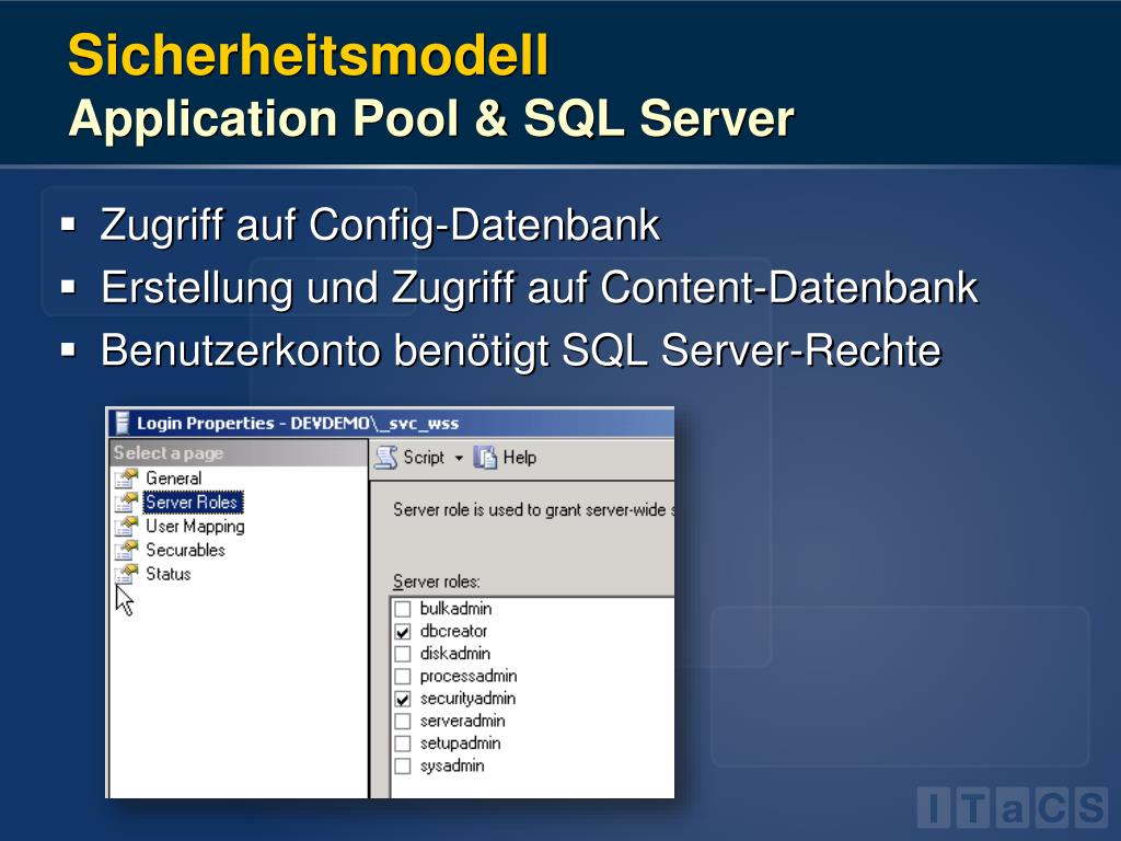 SicherheitsmodellApplication Pool & SQL Server • Zugriff auf Config-Datenbank • Erstellung und Zugriff auf Content-Datenbank • Benutzerkonto benötigt SQL Server-Rechte