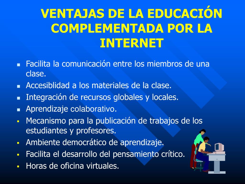VENTAJAS DE LA EDUCACIÓN COMPLEMENTADA POR LA INTERNET • Facilita la comunicación entre los miembros de una clase. • Accesiblidad a los materiales de la clase. • Integración de recursos globales y locales. • Aprendizaje colaborativo. • Mecanismo para la publicación de trabajos de los estudiantes y profesores. • Ambiente democrático de aprendizaje. • Facilita el desarrollo del pensamiento crítico. • Horas de oficina virtuales.