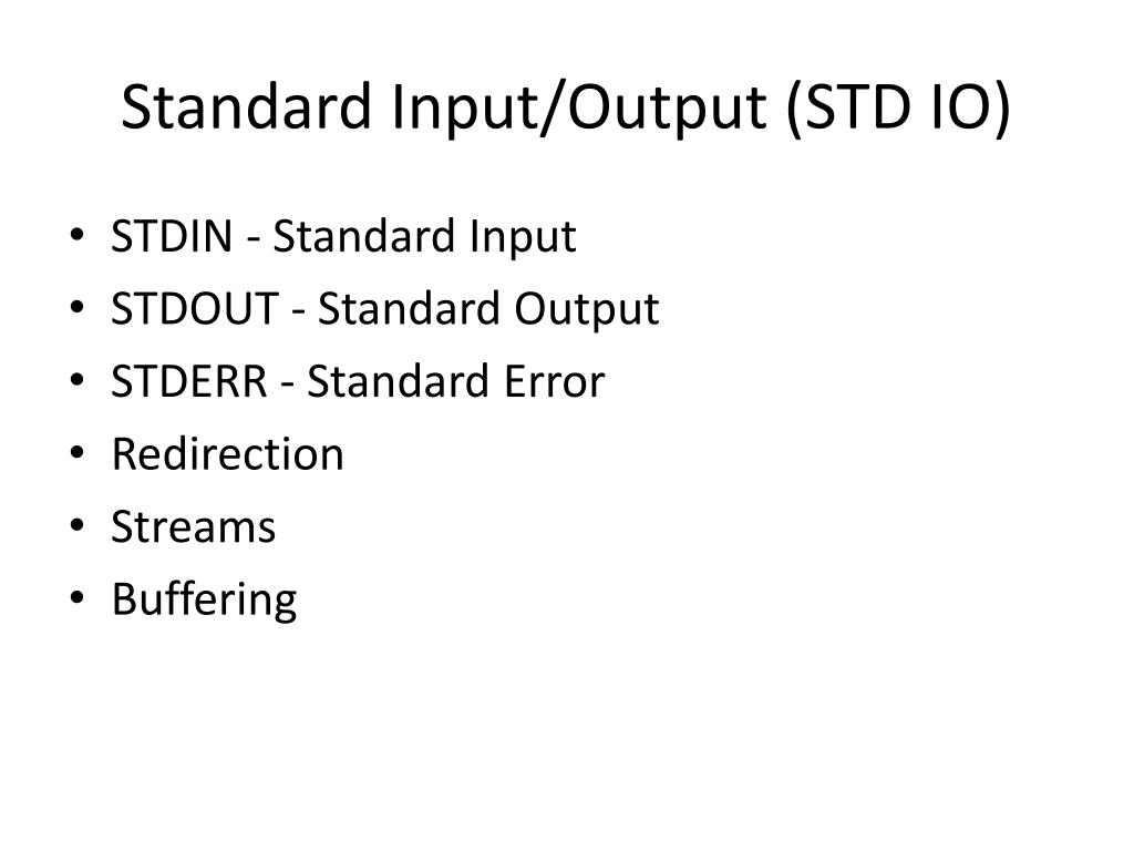 Standard Input/Output (STD IO) • STDIN - Standard Input • STDOUT - Standard Output • STDERR - Standard Error • Redirection • Streams • Buffering