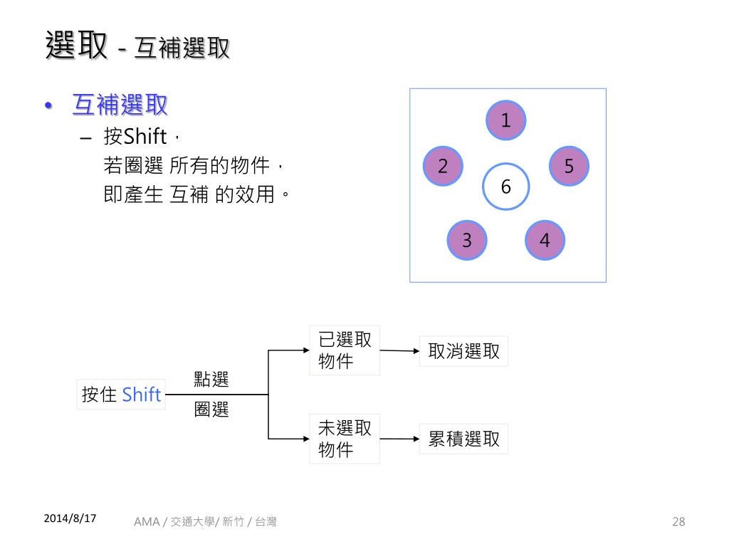 取消選取 按Shift, 若點選 已經選取 的物件, 即產生 取消選取 的效果。 已選取 物件 取消選取 點選 按住 Shift 圈選 未選取 物件 累積選取 選取 - 取消選取 1 2 5 6 3 4 AMA / 交通大學/ 新竹 / 台灣