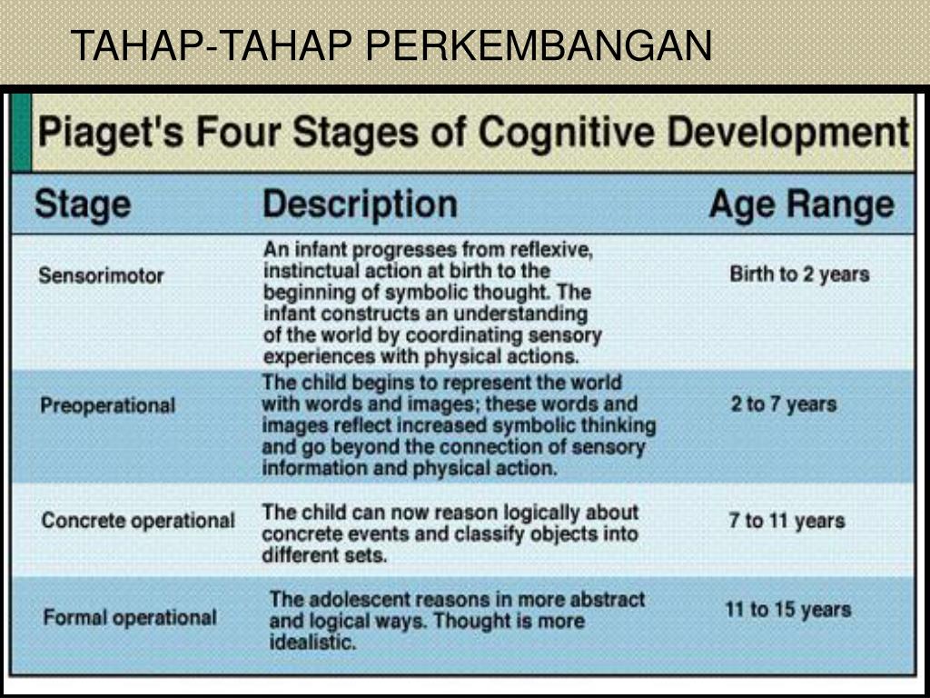 Proses Kognitifhttp://wmpeople.wm.edu/asset/index/mxtsch/devopsych According to Piaget, the developmental ideal is a balance between assimilation and accommodation, which is also known as equilibrium. Piaget believed when a balance between children’s mental schemas, which is a “...mental image produced in response to a stimulus that becomes a framework or basis for analyzing or responding to other related stimuli” and the external world has been reached, children are in a comfortable state of equilibrium (Agnes, 1999, p. 1282).