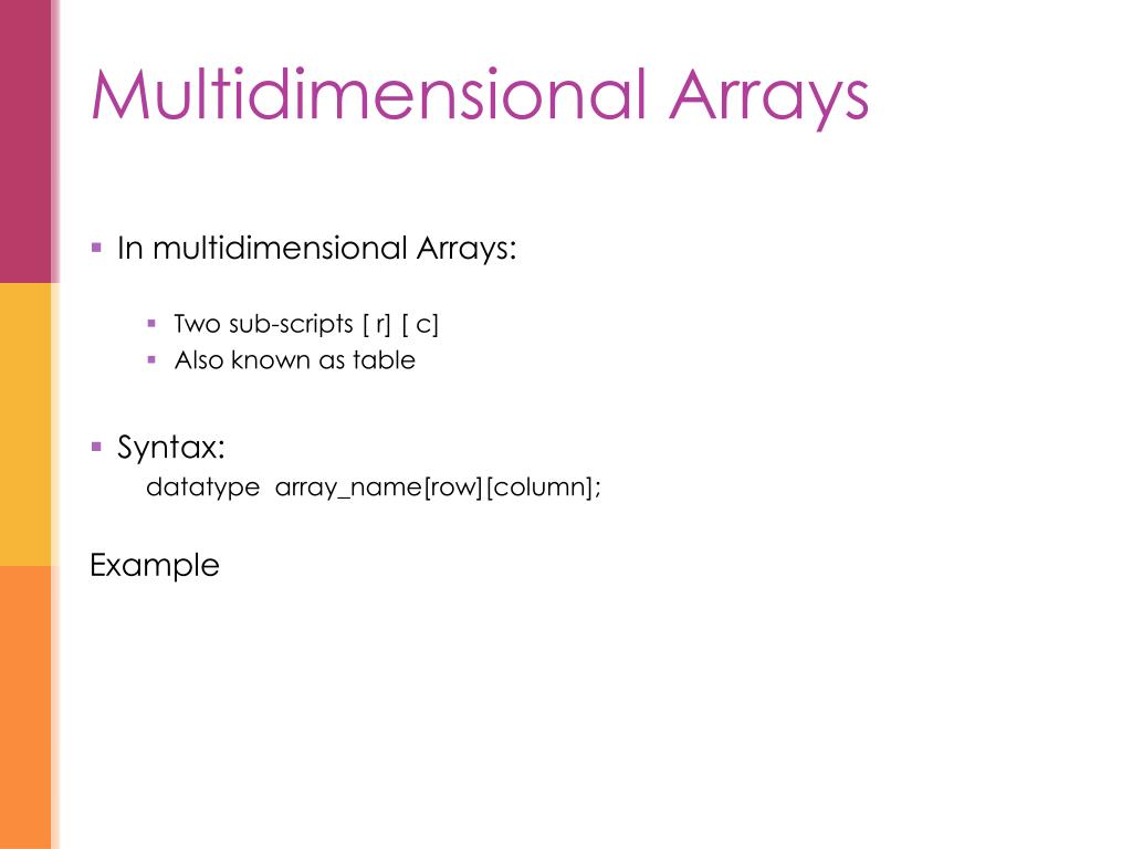 Multidimensional Arrays • In multidimensional Arrays: • Two sub-scripts [ r] [ c] • Also known as table • Syntax: datatype array_name[row][column]; Example