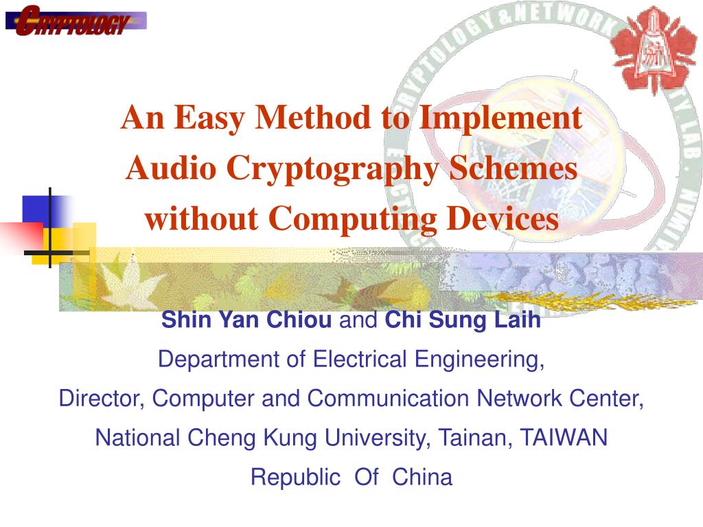 An Easy Method to Implement Audio Cryptography Schemes without Computing Devices Shin Yan Chiou and Chi Sung Laih Department of Electrical Engineering, Director, Computer and Communication Network Center, National Cheng Kung University, Tainan, TAIWAN Republic Of China
