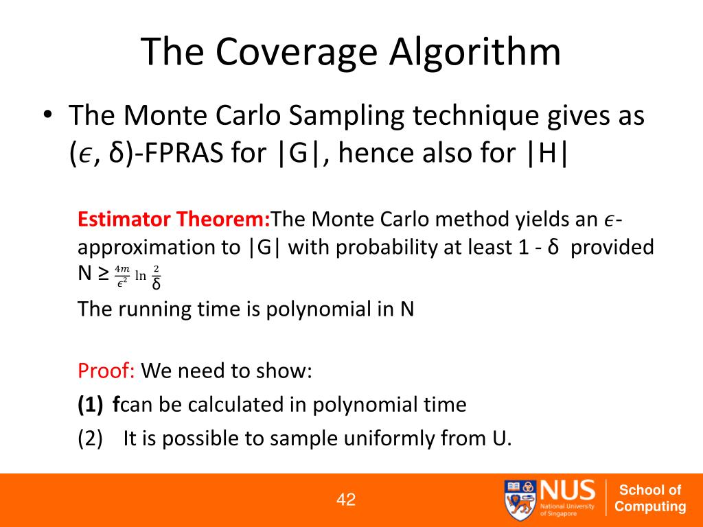 The Coverage Algorithm • The Monte Carlo Sampling technique gives as (, δ)-FPRAS for |G|, hence also for |H| Estimator Theorem:The Monte Carlo method yields an -approximation to |G| with probability at least 1 - δ provided N ≥ The running time is polynomial in N Proof: We need to show: • fcan be calculated in polynomial time • It is possible to sample uniformly from U.