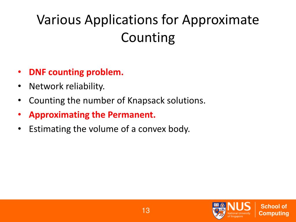Various Applications for Approximate Counting • DNF counting problem. • Network reliability. • Counting the number of Knapsack solutions. • Approximating the Permanent. • Estimating the volume of a convex body.