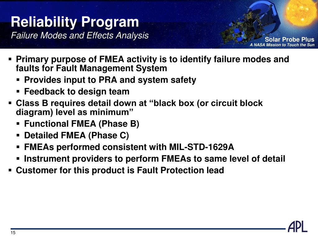 Reliability ProgramFailure Modes and Effects Analysis • Primary purpose of FMEA activity is to identify failure modes and faults for Fault Management System • Provides input to PRA and system safety • Feedback to design team • Class B requires detail down at “black box (or circuit block diagram) level as minimum” • Functional FMEA (Phase B) • Detailed FMEA (Phase C) • FMEAs performed consistent with MIL-STD-1629A • Instrument providers to perform FMEAs to same level of detail • Customer for this product is Fault Protection lead