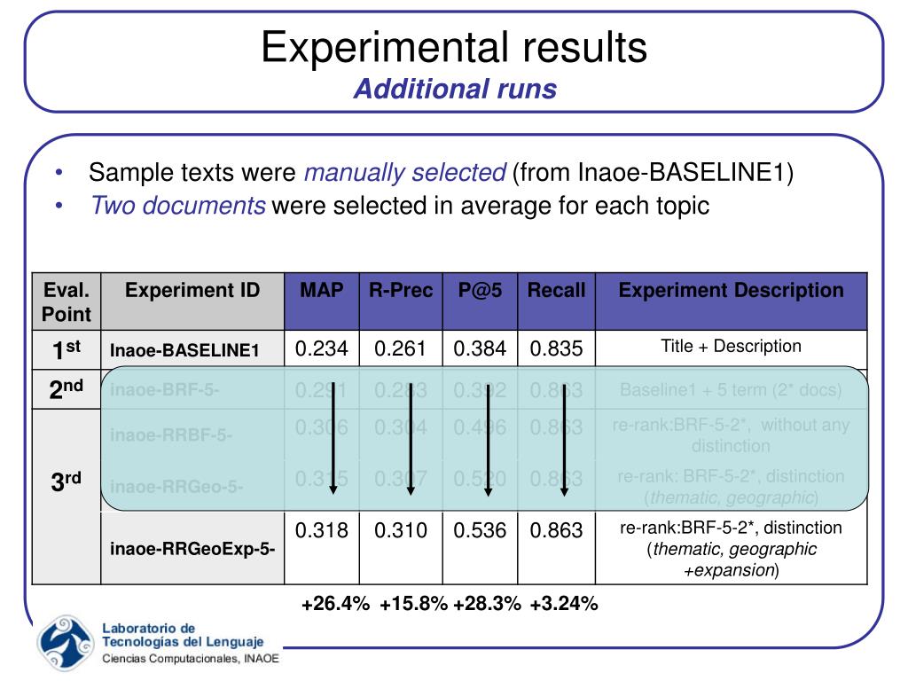 +26.4% +15.8% +28.3% +3.24% Experimental resultsAdditional runs • Sample texts were manually selected (from Inaoe-BASELINE1) • Two documents were selected in average for each topic