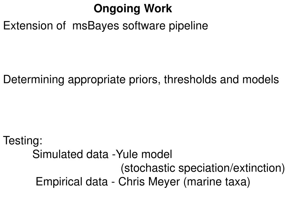 Ongoing Work Extension of msBayes software pipeline Determining appropriate priors, thresholds and models Testing: Simulated data -Yule model (stochastic speciation/extinction) Empirical data - Chris Meyer (marine taxa)