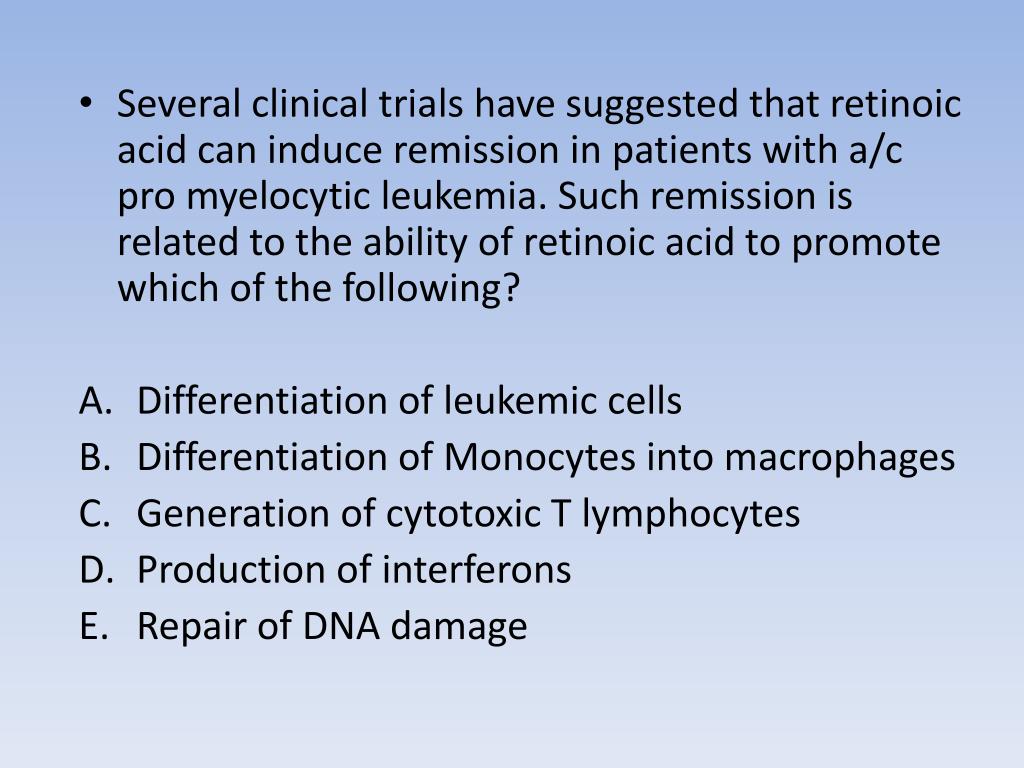 Several clinical trials have suggested that retinoic acid can induce remission in patients with a/c pro myelocytic leukemia. Such remission is related to the ability of retinoic acid to promote which of the following? • Differentiation of leukemic cells • Differentiation of Monocytes into macrophages • Generation of cytotoxic T lymphocytes • Production of interferons • Repair of DNA damage
