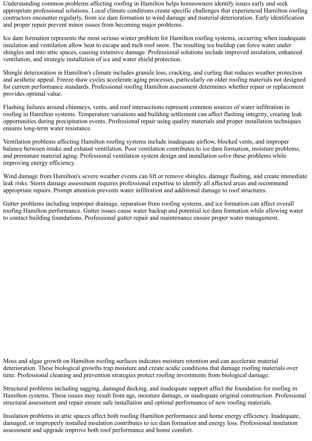 Hamilton Roofing Maintenance and Care Guidelines Proper maintenance extends the lifespan and performance of roofing in Hamilton systems while preventing costly repairs and premature replacement needs. Professional Hamilton roofing contractors recommend specific maintenance schedules and procedures tailored to local climate conditions and material requirements. Regular maintenance protects your investment while ensuring continued weather protection and energy efficiency. Annual inspection schedules for Hamilton roofing systems should include comprehensive visual assessment of all roofing components, including shingles, flashing, gutters, and ventilation systems. Spring inspections identify winter damage and prepare systems for summer weather, while fall inspections ensure readiness for Hamilton's challenging winter conditions. Professional inspections identify potential problems before they become expensive repairs. Gutter cleaning and maintenance represent critical components of roofing Hamilton care, particularly given our heavy seasonal precipitation and leaf fall. Clogged gutters can cause water backup that damages roofing materials and creates ice dam conditions during winter months. Regular cleaning and inspection ensure proper drainage and prevent water- related damage to roofing systems. Snow removal considerations for Hamilton roofing systems focus on preventing ice dam formation while avoiding damage to roofing materials. Professional snow removal techniques protect shingles and gutters while reducing excessive load on roof structures. Homeowners should understand when professional snow removal becomes necessary and how to identify potential problems. Debris removal from roofing in Hamilton systems prevents water retention and material damage while maintaining proper drainage function. Fallen leaves, branches, and other debris can trap moisture and accelerate material deterioration. Regular cleaning, particularly after storms, maintains optimal roof performance and prevents premature aging. Attic ventilation monitoring ensures optimal moisture and temperature control that prevents ice dam formation and extends material lifespan. Proper ventilation balance between intake and exhaust vents maintains ideal attic conditions throughout Hamilton's varying seasonal weather. Professional assessment identifies ventilation problems before they affect roofing performance. Flashing inspection and maintenance prevent water infiltration around penetrations and roof intersections where leaks commonly develop. Hamilton's freeze-thaw cycles can affect flashing performance, making regular inspection particularly important. Professional Hamilton roofing services include flashing assessment and preventive maintenance recommendations. Moss and algae prevention becomes important in Hamilton's humid climate conditions, particularly on roofs with limited sun exposure. Growth of organic materials can damage roofing materials and create moisture retention problems. Understanding prevention techniques and safe removal methods protects roofing Hamilton investments from biological damage. Tree management around Hamilton roofing systems prevents damage from falling branches while reducing debris accumulation and shade-related problems. Proper pruning maintains safe clearances and reduces maintenance requirements while preserving the aesthetic benefits of mature trees. Professional arborist consultation ensures optimal tree management strategies. Professional maintenance programs offer comprehensive care for roofing in Hamilton systems through scheduled inspections, preventive maintenance, and prompt repair services. These programs provide peace of mind while ensuring optimal performance and warranty compliance. Regular professional attention identifies and addresses problems before they require extensive repairs. Seasonal preparation routines help roofing Hamilton systems perform optimally throughout our challenging weather cycles. Spring preparation includes inspection and repair of winter damage, while fall preparation ensures readiness for snow loads and ice formation. Following seasonal maintenance schedules prevents weather-related problems. Documentation of maintenance activities supports warranty compliance and helps track roof condition over time. Maintaining records of inspections, repairs, and maintenance activities provides valuable information for insurance claims and eventual replacement planning. Professional Hamilton roofing contractors provide detailed documentation of all services performed. Common Hamilton Roofing Problems and Solutions