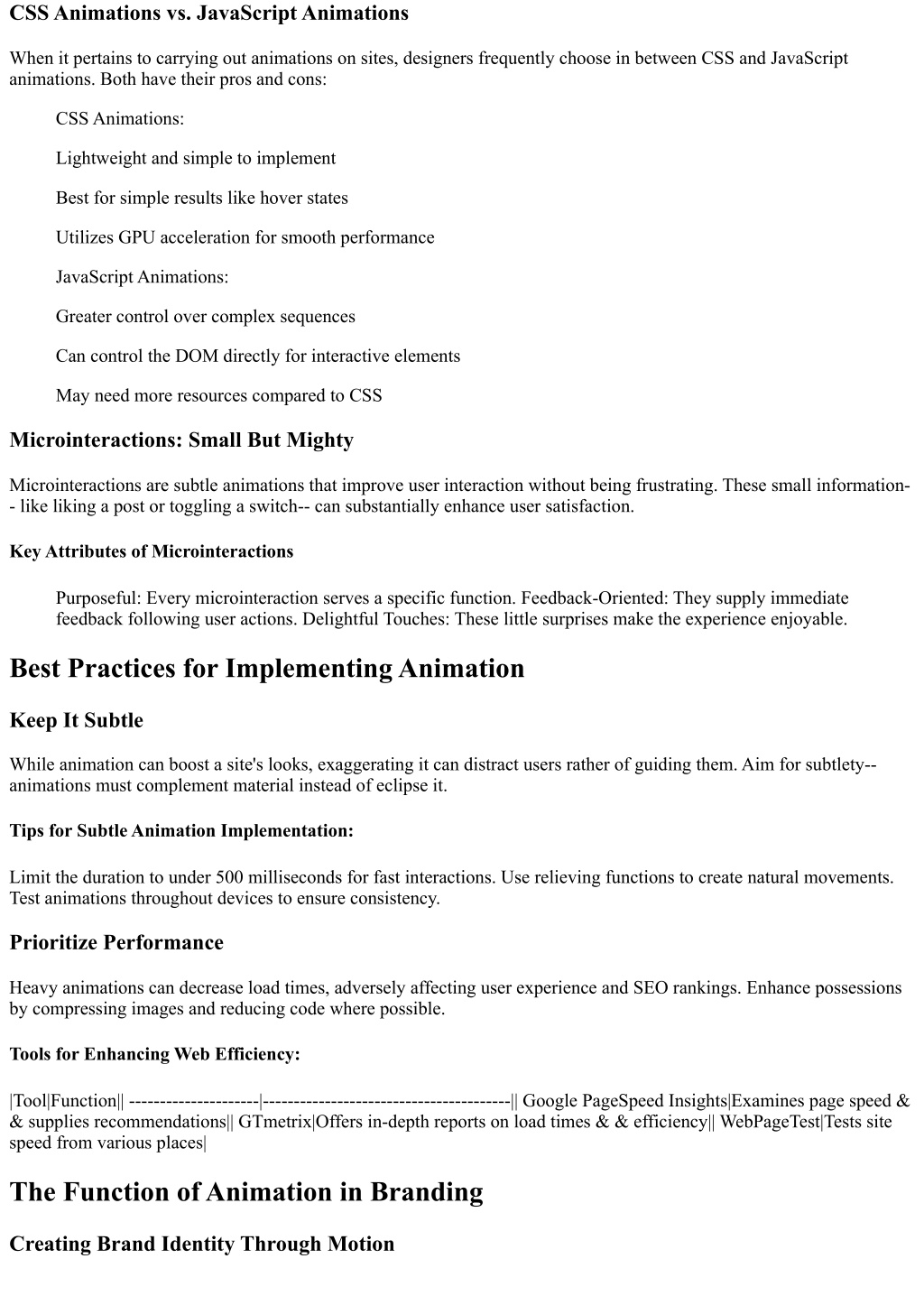 CSS Animations vs. JavaScript Animations When it pertains to carrying out animations on sites, designers frequently choose in between CSS and JavaScript animations. Both have their pros and cons: CSS Animations: Lightweight and simple to implement Best for simple results like hover states Utilizes GPU acceleration for smooth performance JavaScript Animations: Greater control over complex sequences Can control the DOM directly for interactive elements May need more resources compared to CSS Microinteractions: Small But Mighty Microinteractions are subtle animations that improve user interaction without being frustrating. These small information- - like liking a post or toggling a switch-- can substantially enhance user satisfaction. Key Attributes of Microinteractions Purposeful: Every microinteraction serves a specific function. Feedback-Oriented: They supply immediate feedback following user actions. Delightful Touches: These little surprises make the experience enjoyable. Best Practices for Implementing Animation Keep It Subtle While animation can boost a site's looks, exaggerating it can distract users rather of guiding them. Aim for subtlety-- animations must complement material instead of eclipse it. Tips for Subtle Animation Implementation: Limit the duration to under 500 milliseconds for fast interactions. Use relieving functions to create natural movements. Test animations throughout devices to ensure consistency. Prioritize Performance Heavy animations can decrease load times, adversely affecting user experience and SEO rankings. Enhance possessions by compressing images and reducing code where possible. Tools for Enhancing Web Efficiency: |Tool|Function|| ---------------------|----------------------------------------|| Google PageSpeed Insights|Examines page speed & & supplies recommendations|| GTmetrix|Offers in-depth reports on load times & & efficiency|| WebPageTest|Tests site speed from various places| The Function of Animation in Branding Creating Brand Identity Through Motion
