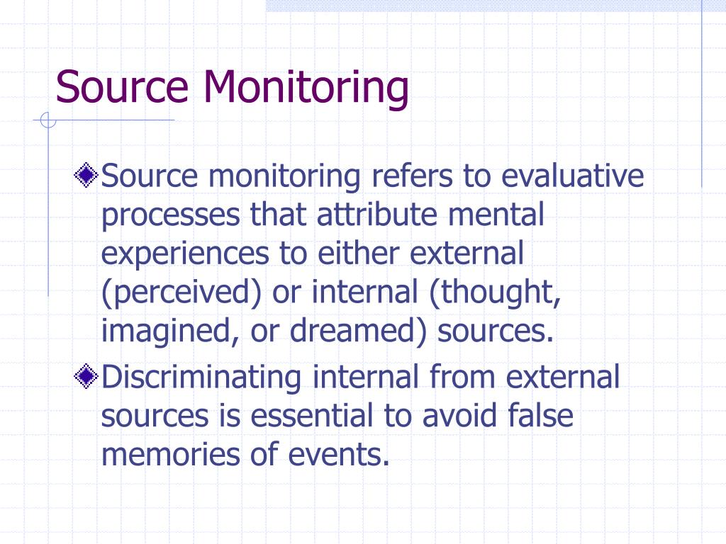 Source Monitoring • Source monitoring refers to evaluative processes that attribute mental experiences to either external (perceived) or internal (thought, imagined, or dreamed) sources. • Discriminating internal from external sources is essential to avoid false memories of events.