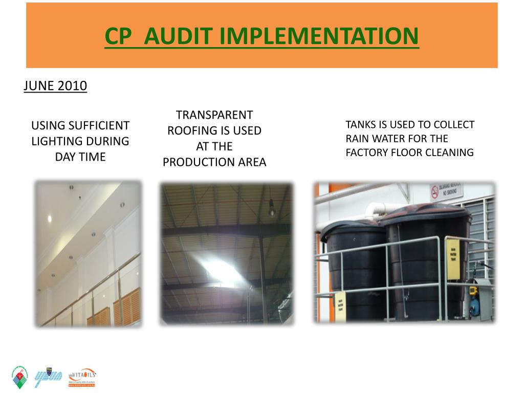 CP AUDIT IMPLEMENTATION JUNE 2010 TRANSPARENT ROOFING IS USED AT THE PRODUCTION AREA USING SUFFICIENT LIGHTING DURING DAY TIME TANKS IS USED TO COLLECT RAIN WATER FOR THE FACTORY FLOOR CLEANING