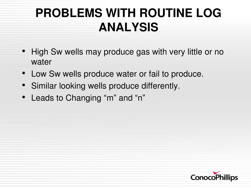 PROBLEMS WITH ROUTINE LOG ANALYSIS • High Sw wells may produce gas with very little or no water • Low Sw wells produce water or fail to produce. • Similar looking wells produce differently. • Leads to Changing “m” and “n”