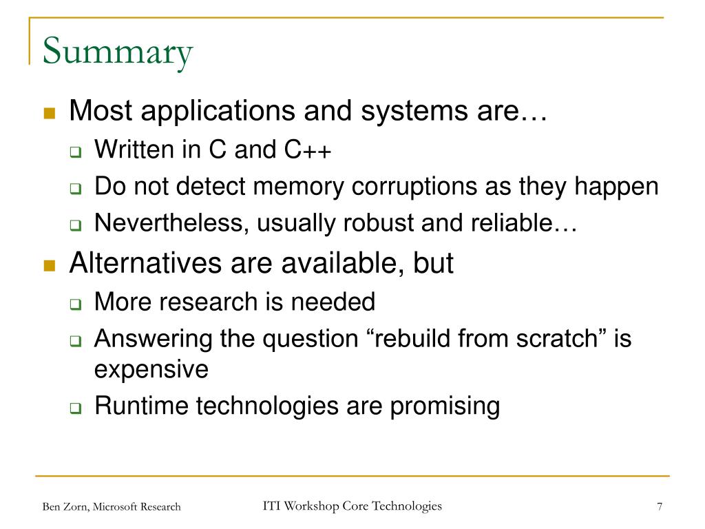 Summary • Most applications and systems are… • Written in C and C++ • Do not detect memory corruptions as they happen • Nevertheless, usually robust and reliable… • Alternatives are available, but • More research is needed • Answering the question “rebuild from scratch” is expensive • Runtime technologies are promising ITI Workshop Core Technologies