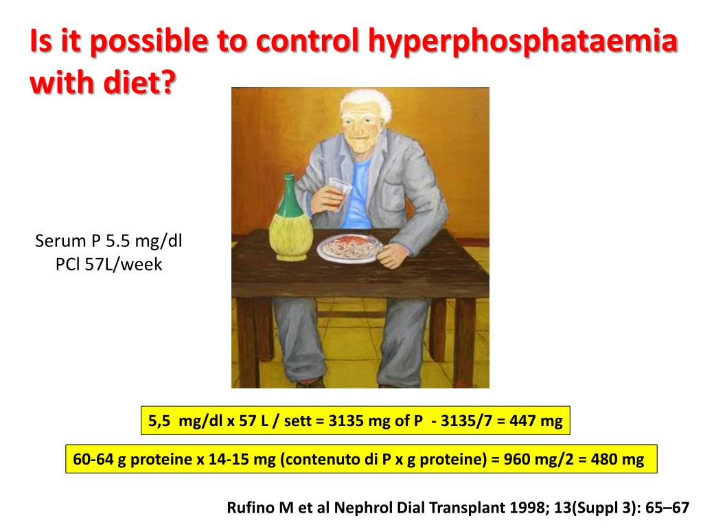 Is it possible to control hyperphosphataemiawith diet? Serum P 5.5 mg/dl PCl 57L/week 5,5 mg/dl x 57 L / sett = 3135 mg of P - 3135/7 = 447 mg 60-64 g proteine x 14-15 mg (contenuto di P x g proteine) = 960 mg/2 = 480 mg Rufino M et al NephrolDialTransplant 1998; 13(Suppl 3): 65–67