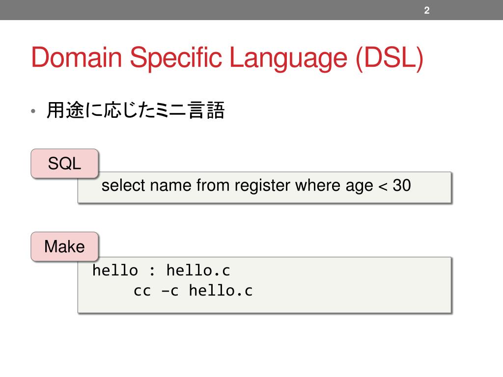 Domain Specific Language (DSL) • 用途に応じたミニ言語 SQL select name from register where age < 30 Make hello : hello.c cc –c hello.c
