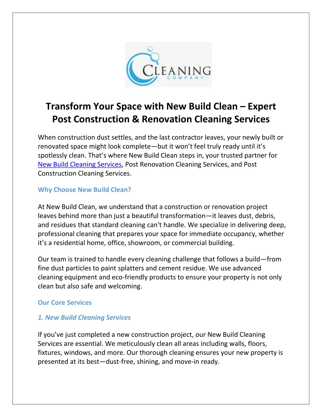 Transform Your Space with New Build Clean – Expert Post Construction & Renovation Cleaning Services When construction dust settles, and the last contractor leaves, your newly built or renovated space might look complete—but it won’t feel truly ready until it’s spotlessly clean. That’s where New Build Clean steps in, your trusted partner for New Build Cleaning Services, Post Renovation Cleaning Services, and Post Construction Cleaning Services. Why Choose New Build Clean? At New Build Clean, we understand that a construction or renovation project leaves behind more than just a beautiful transformation—it leaves dust, debris, and residues that standard cleaning can't handle. We specialize in delivering deep, professional cleaning that prepares your space for immediate occupancy, whether it’s a residential home, office, showroom, or commercial building. Our team is trained to handle every cleaning challenge that follows a build—from fine dust particles to paint splatters and cement residue. We use advanced cleaning equipment and eco-friendly products to ensure your property is not only clean but also safe and welcoming. Our Core Services 1. New Build Cleaning Services If you’ve just completed a new construction project, our New Build Cleaning Services are essential. We meticulously clean all areas including walls, floors, fixtures, windows, and more. Our thorough cleaning ensures your new property is presented at its best—dust-free, shining, and move-in ready.