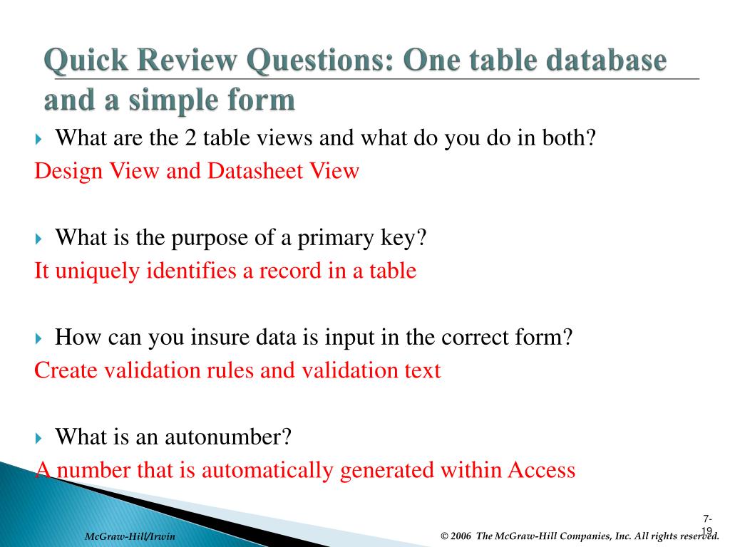 Quick Review Questions: One table database and a simple form • What are the 2 table views and what do you do in both? Design View and Datasheet View • What is the purpose of a primary key? It uniquely identifies a record in a table • How can you insure data is input in the correct form? Create validation rules and validation text • What is an autonumber? A number that is automatically generated within Access