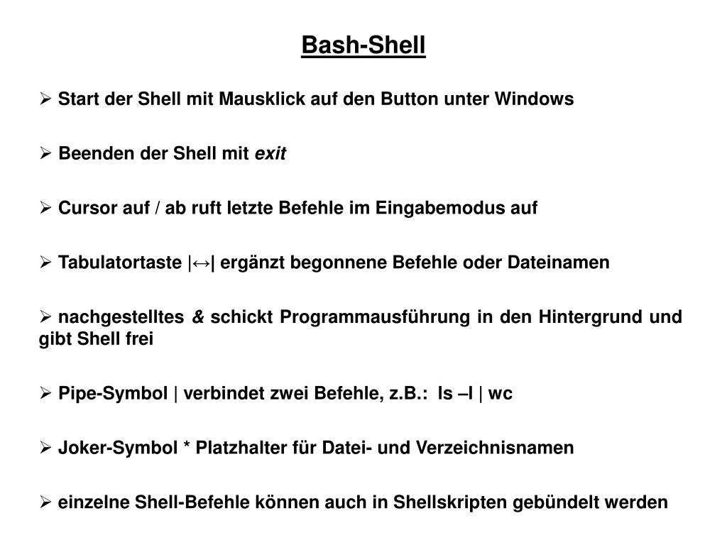 Bash-Shell • Start der Shell mit Mausklick auf den Button unter Windows • Beenden der Shell mit exit • Cursor auf / ab ruft letzte Befehle im Eingabemodus auf • Tabulatortaste |↔| ergänzt begonnene Befehle oder Dateinamen • nachgestelltes & schickt Programmausführung in den Hintergrund und gibt Shell frei • Pipe-Symbol | verbindet zwei Befehle, z.B.: ls –l | wc • Joker-Symbol * Platzhalter für Datei- und Verzeichnisnamen • einzelne Shell-Befehle können auch in Shellskripten gebündelt werden