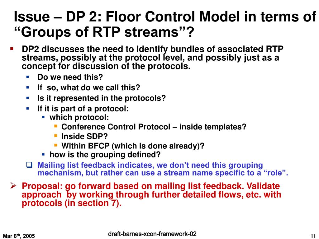 Issue – DP 2: Floor Control Model in terms of “Groups of RTP streams”? • DP2 discussesthe need to identify bundles of associated RTP streams, possibly at the protocol level, and possibly just as a concept for discussion of the protocols. • Do we need this? • If so, what do we call this? • Is it represented in the protocols? • If it is part of a protocol: • which protocol: • Conference Control Protocol – inside templates? • Inside SDP? • Within BFCP (which is done already)? • how is the grouping defined? • Mailing list feedback indicates, we don’t need this grouping mechanism, but rather can use a stream name specific to a “role”. • Proposal: go forward based on mailing list feedback. Validate approach by working through further detailed flows, etc. with protocols (in section 7).
