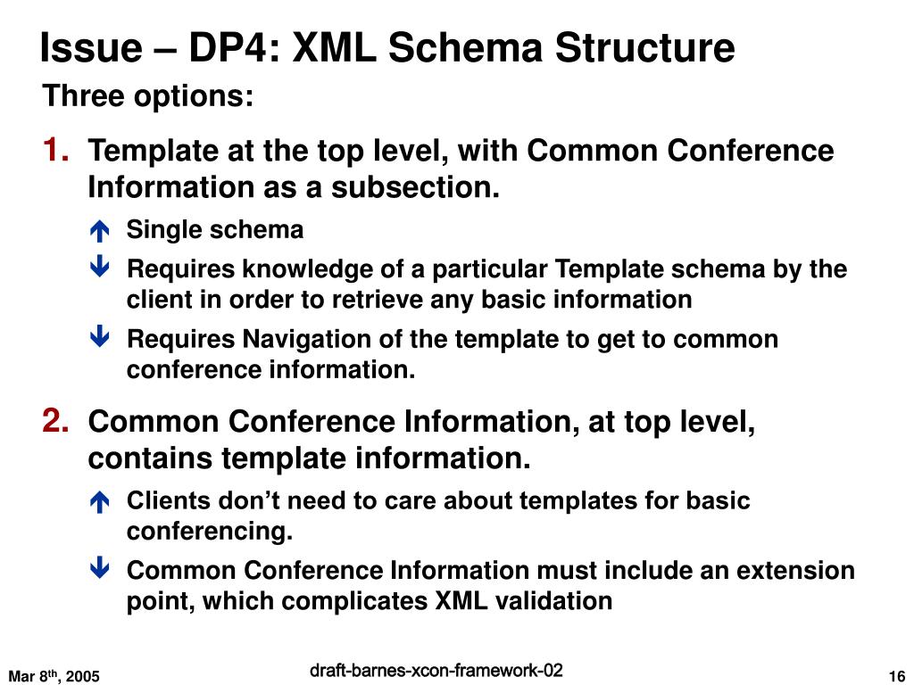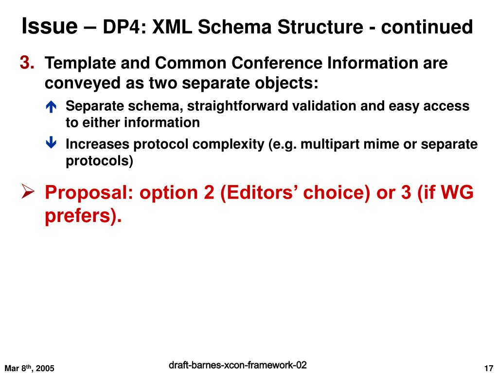 Issue – DP4: XML Schema Structure - continued • Template and Common Conference Information are conveyed as two separate objects: • Separate schema, straightforward validation and easy access to either information • Increases protocol complexity (e.g. multipart mime or separate protocols) • Proposal: option 2 (Editors’ choice) or 3 (if WG prefers).