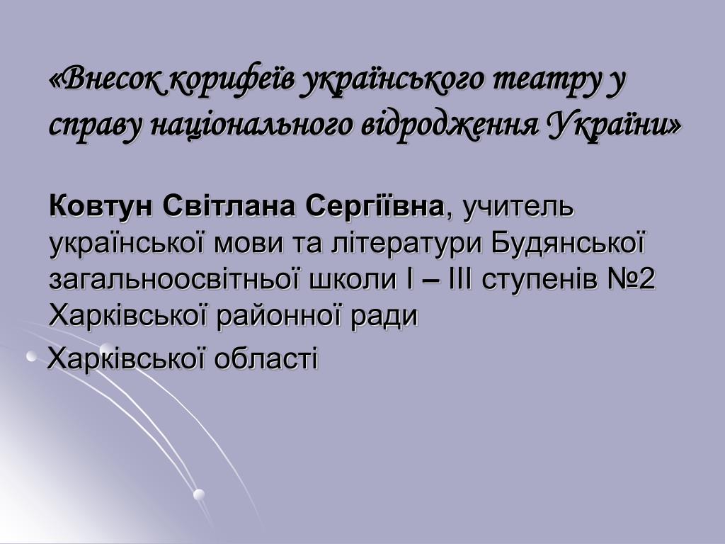 «Внесок корифеїв українського театру у справу національного відродження України» Ковтун Світлана Сергіївна, учитель української мови та літератури Будянської загальноосвітньої школи І – ІІІ ступенів №2 Харківської районної ради Харківської області