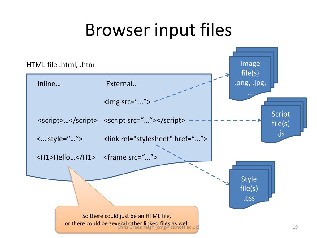 Browser input files Image file(s).png, .jpg, … HTML file .html, .htm Inline… External… <imgsrc=“…”> Script file(s).js <script>…</script> <script src=“…“></script> <… style=“…”> <link rel="stylesheet" href=“…”> <H1>Hello…</H1> <frame src=“…”> Style file(s).css So there could just be an HTML file, or there could be several other linked files as well Chris Greenhalgh (cmg@cs.nott.ac.uk)
