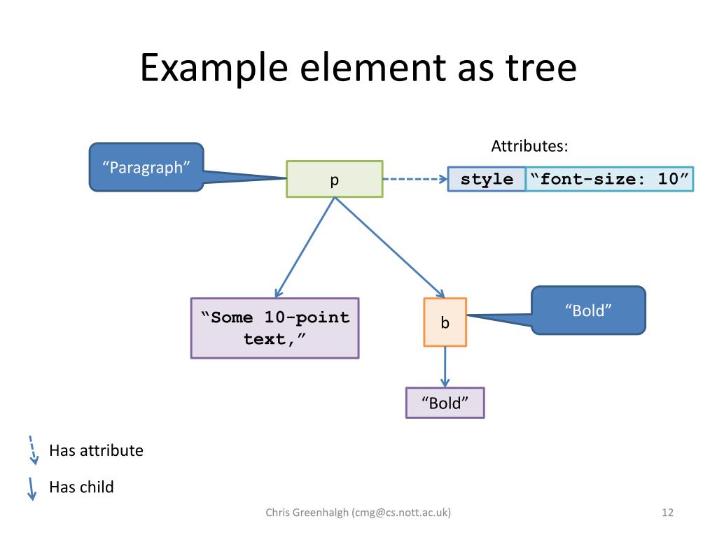Example element as tree Attributes: “Paragraph” p style “font-size: 10” “Bold” “Some 10-point text,” b “Bold” Has attribute Has child Chris Greenhalgh (cmg@cs.nott.ac.uk)