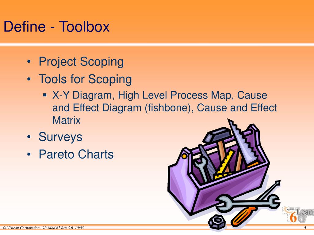 Define - Toolbox • Project Scoping • Tools for Scoping • X-Y Diagram, High Level Process Map, Cause and Effect Diagram (fishbone), Cause and Effect Matrix • Surveys • Pareto Charts