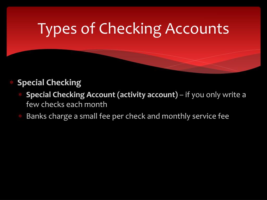 Types of Checking Accounts • Special Checking • Special Checking Account (activity account) – if you only write a few checks each month • Banks charge a small fee per check and monthly service fee
