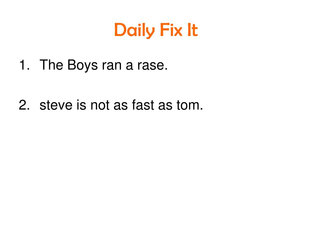Daily Fix It • The Boys ran a rase. The boys ran a race. • steve is not as fast as tom. Steve is not as fast as Tom.