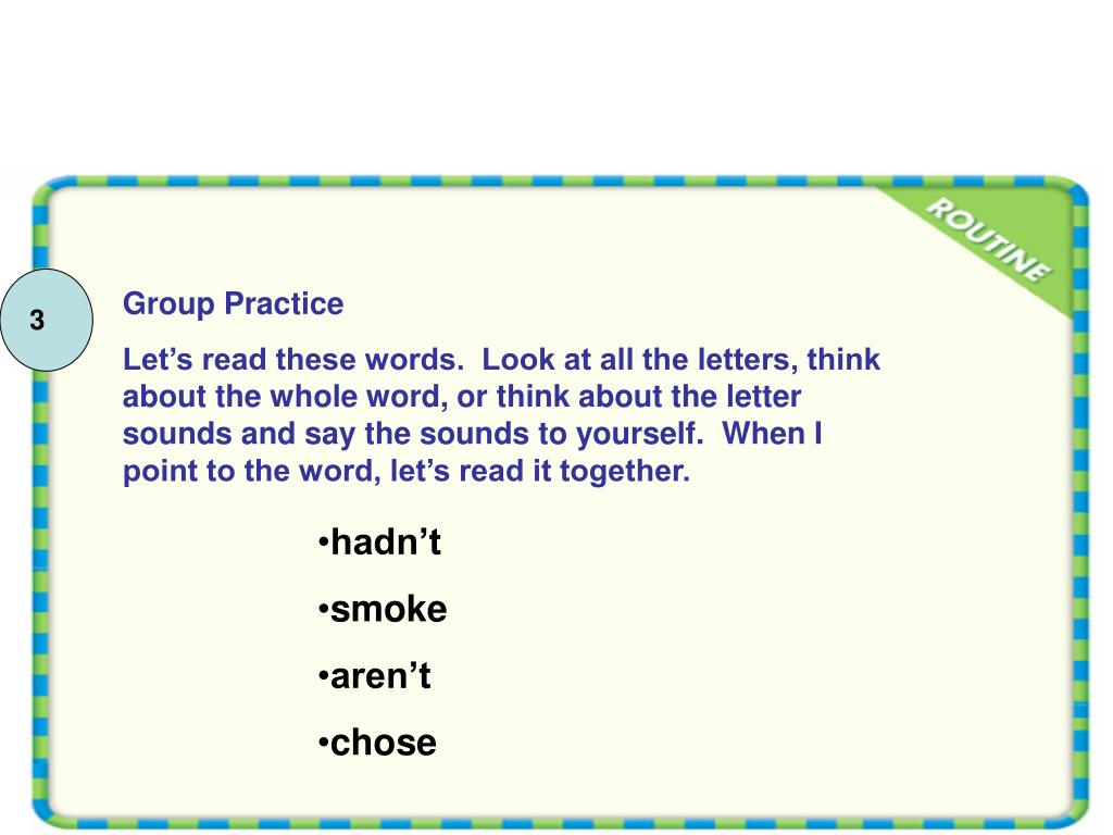 Group Practice Let’s read these words. Look at all the letters, think about the whole word, or think about the letter sounds and say the sounds to yourself. When I point to the word, let’s read it together. 3 • hadn’t • smoke • aren’t • chose