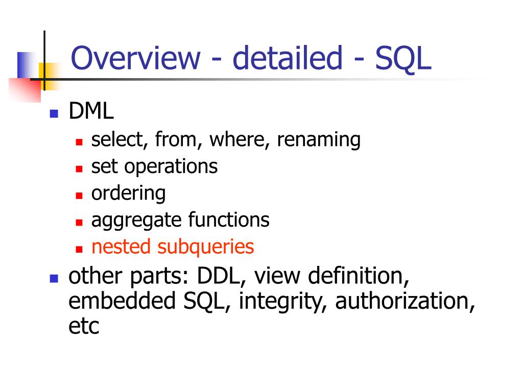 Overview - detailed - SQL • DML • select, from, where, renaming • set operations • ordering • aggregate functions • nested subqueries • other parts: DDL, view definition, embedded SQL, integrity, authorization, etc